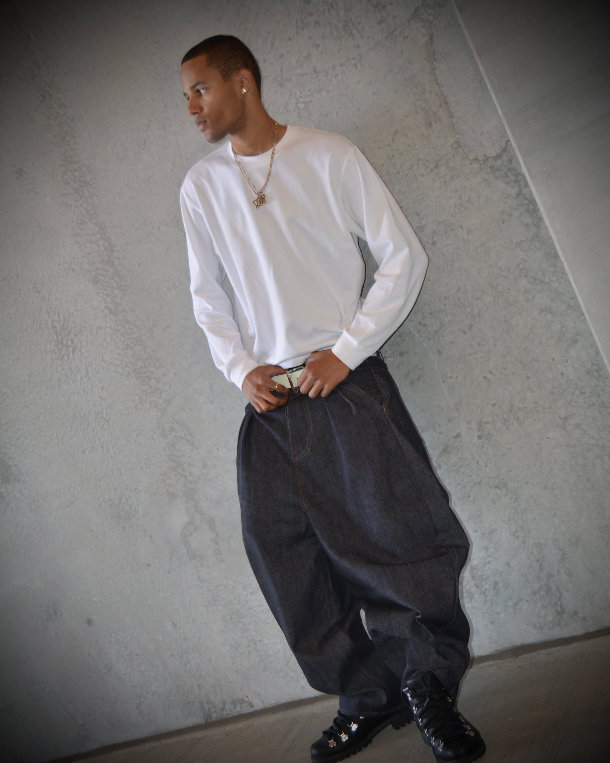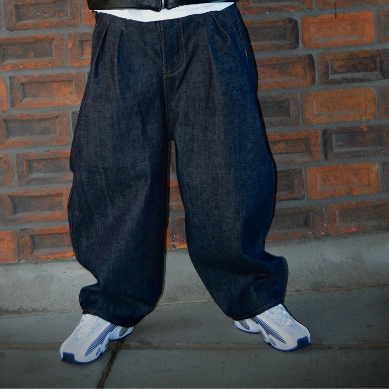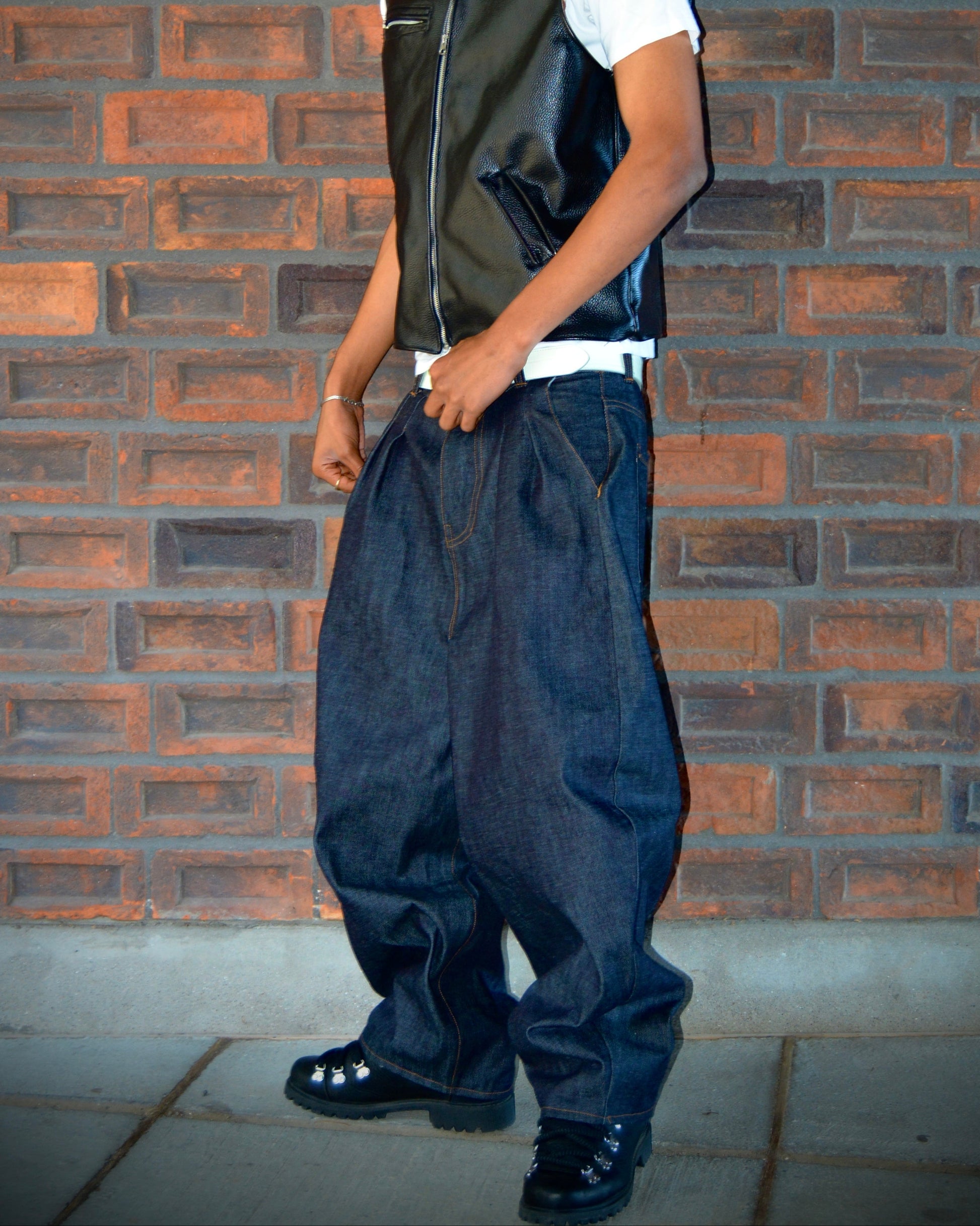 The pleated front adds structure and attitude, while the wide, relaxed fit keeps the silhouette effortless. Every stitch, fold, and finish is done by hand — no shortcuts, no mass production.
